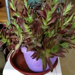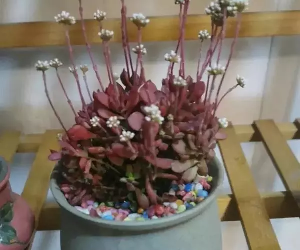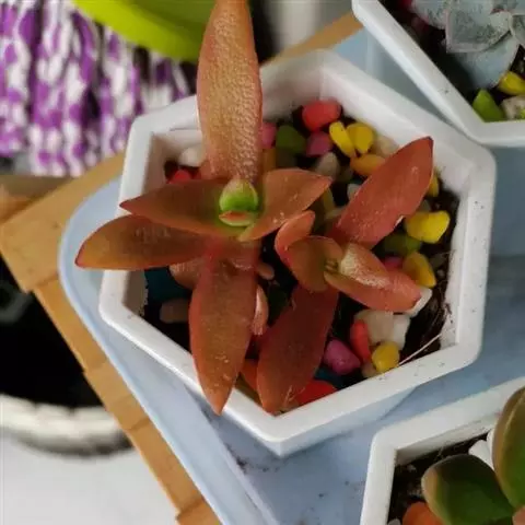 红稚儿为多年生肉质草本植物,植株丛生,有细小的分枝,茎 红稚儿 肉质,时间养久了茎会逐渐半木质化,红稚儿叶片有点薄,叶片颜色绿,叶缘较薄,在晚秋和早春,温差大的时候整个植株全部会变成红褐色。红稚儿叶片交互对生无叶柄,基部连在一起,新叶上下叠生,成叶上下有些许间隔。开花为白色,簇状花序。