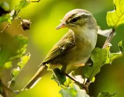 林柳莺(学名:Phylloscopus sibilatrix):体长约11厘米,是一种体型小的黄绿色柳莺。两性相似。上体除两翅和尾羽暗褐色外,余均呈黄绿色;眉纹自嘴基伸向颈后,呈黄色;贯眼纹短,呈暗褐色;脸颊、颏、喉、胸呈黄色,但胸部色淡,腹部为丝光白色。虹膜褐色;上嘴黑褐色,下嘴肉黄色;跗蹠黄褐色。