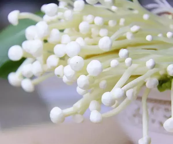 ⑴菌丝体由孢子萌发而成, 在人工培养条件下,菌丝通常呈白色绒毛状,有横隔和分枝,很多菌丝聚集在一起便成菌丝体。和其它食用菌不同的是,菌丝长到一定阶段会形成大量的单细胞粉孢子(也叫分生孢子),在适宜的条件下可萌发成单核菌 丝或双核菌丝。有人在实验中发现,金针菇菌丝阶段的粉孢子多少与金针菇的质量有关,粉孢子多的菌株质量都差,菌柄基部颜色较深。