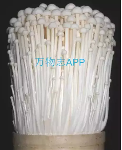 白金针菇 浙江省江山市微生物研究所菌株。出菇整齐,每丛200株左右,柄长15~23厘米,菌盖内卷,不易开伞。白色品系对光线不敏感,即使栽培环境有较强的散射光,子实体仍是通体洁白,有光泽,适合制罐或盐渍加工出口。