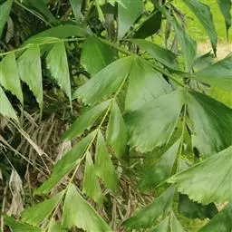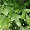 叶大型,呈扇状深裂,形成近半月形,叶片长1.5-2米,宽约2.5-3.5米,裂片80-100,裂至中部,剑形,先端浅2裂,长60-100厘米,裂片宽7-9厘米;叶柄长2.5-3米,粗壮,宽7-10厘米,上面有沟槽,边缘具短齿,顶端延伸成下弯的中肋状的叶轴,长约70-90厘米。