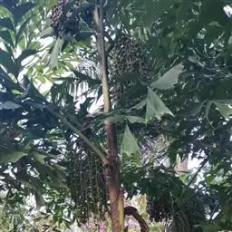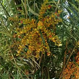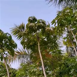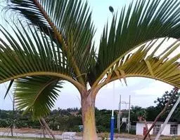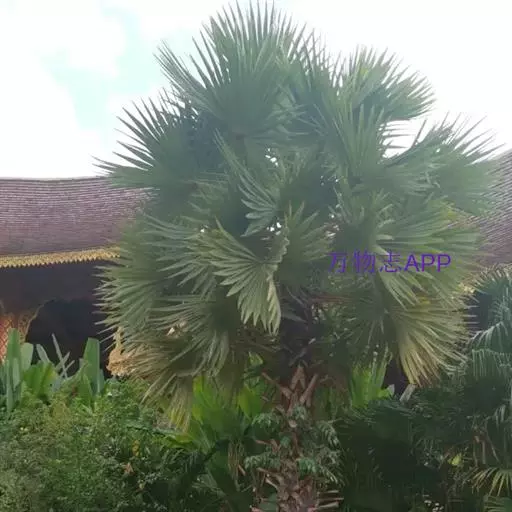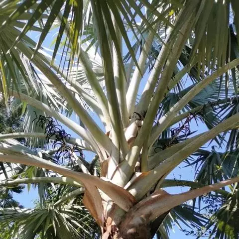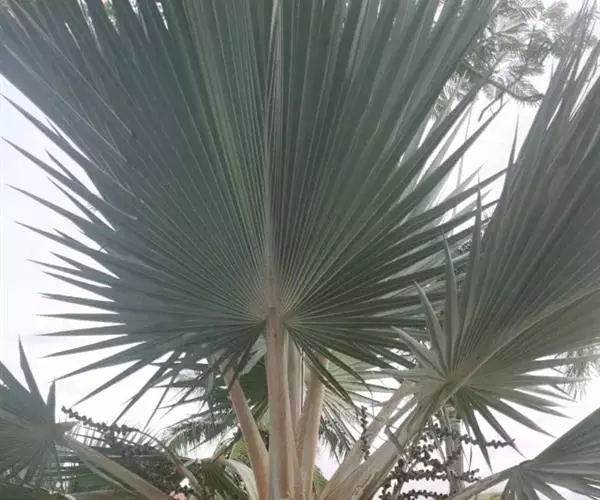 贝叶棕(学名:Corypha umbraculifera L.)是棕榈科,贝叶棕属植株高大粗壮乔木状植物,高可达25米,具较密的环状叶痕。叶片大,半月型,呈扇状深裂,裂片裂至中部,剑形,叶柄粗壮,上面有沟槽,边缘具短齿,花序顶生直立、圆锥形,序轴上由佛焰苞所包被,上面着生花;花两性,小,乳白色,有臭味。果实球形,种子近球形或卵球形,胚顶生。2-4月开花,翌年5-6月结果。