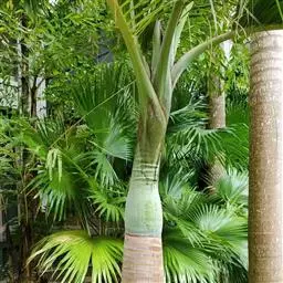 霸王棕是棕榈科霸王棕属常绿乔木,高可达20~30米。基部膨大,叶基宿存。叶片扇形,掌状分裂,…
