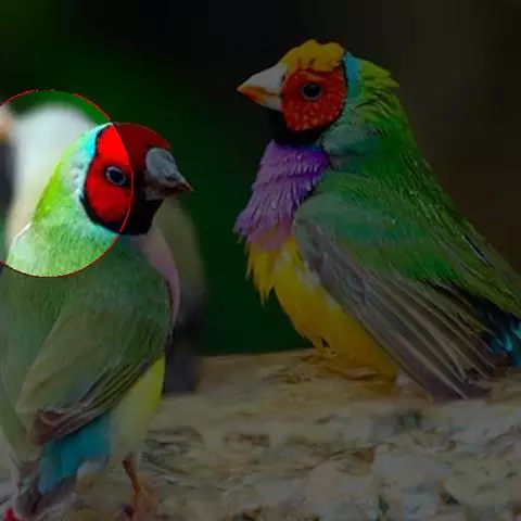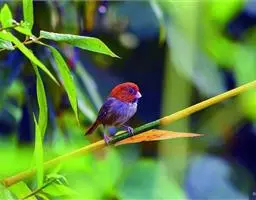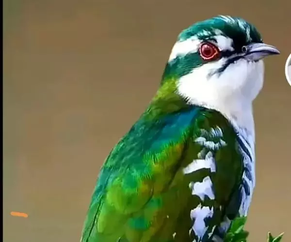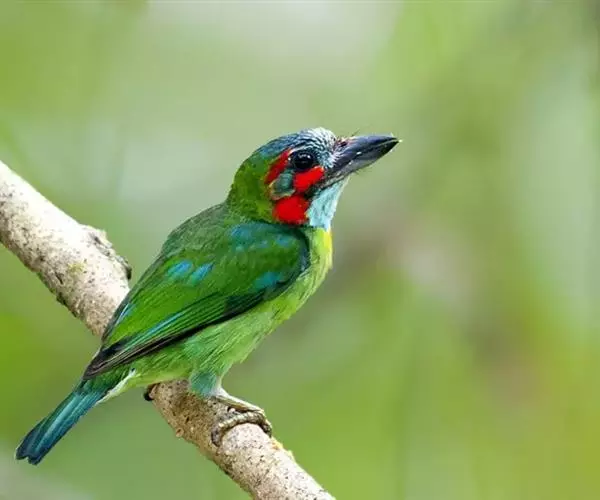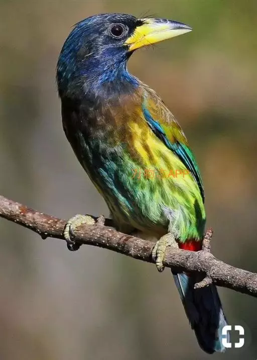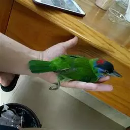 长20cm 嘴粗厚 ,黑色 ,脚铅灰色 。头部大致为蓝色 ,额 、喉黄色 ,眉斑杂有黑色羽毛 ,眼先有红色斑点 ,前颈亦有红斑 。后颈 、背部鲜绿色 , 胸以下鲜黄绿色 。