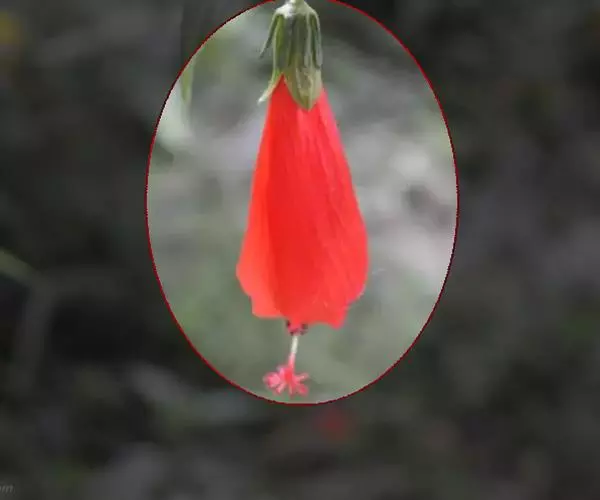 垂花悬铃花(学名:Malvaviscus penduliflorus Moc. & Sessé ex DC.)是锦葵科、悬铃花属常绿小灌木,外型略似朱槿,但叶片较为狭长浓绿;高30-60厘米,叶片互生,卵形或卵状矩圆形,单叶,有时浅裂,叶形变化较多,叶面具星状毛。花红色,花通常单生于上部叶腋处,下垂,花冠呈漏斗形,五枚花瓣略左旋作卷筒状,仅上部略微展开,雌雄蕊细长突出花瓣外,看似永远含苞待放。