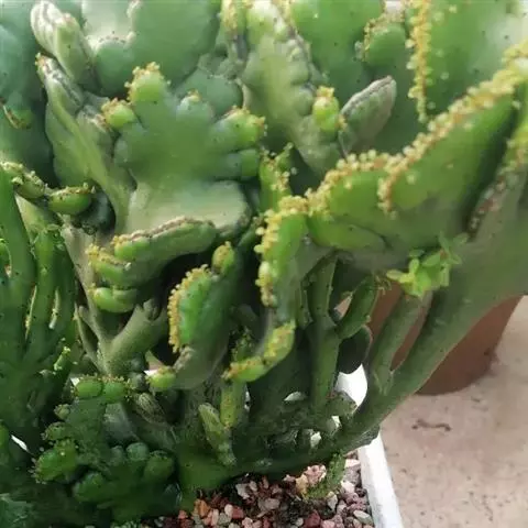 魁伟玉原产南非,是一种大戟科的多年生肉质植物,植株具粗圆筒形肉质茎,有10条以上的突出棱,…