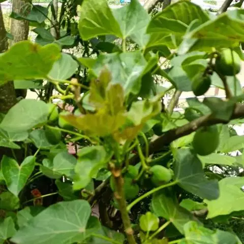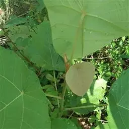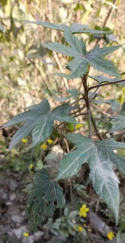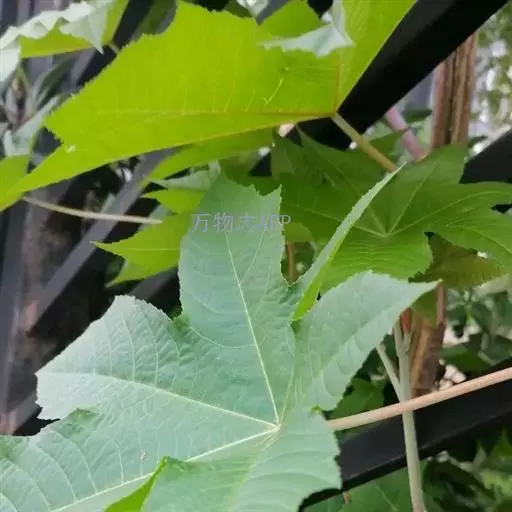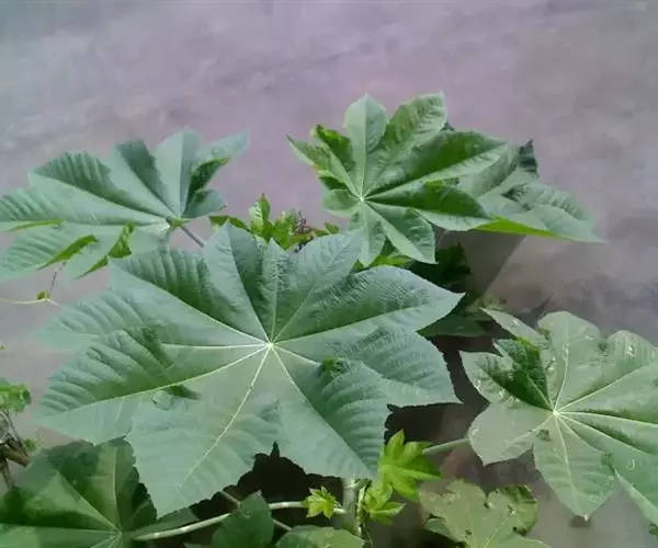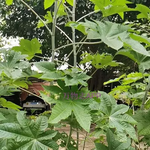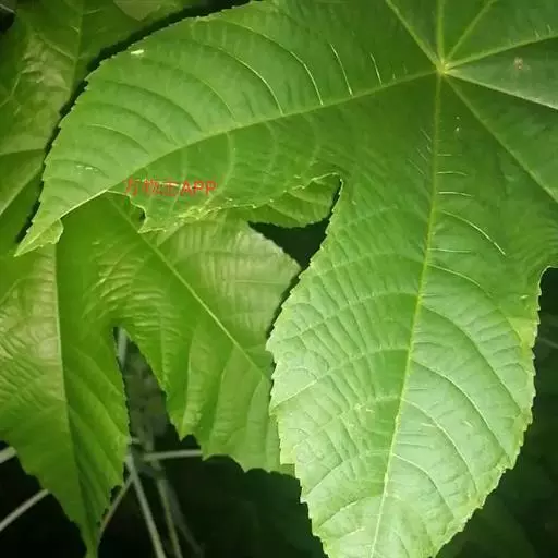 叶轮廓近圆形,长和宽达40厘米或更大,掌状7-11裂,裂缺几达中部,裂片卵状长圆形或披针形,顶端急尖或渐尖,边缘具锯齿。网脉明显;叶柄粗壮,中空,长可达40厘米,顶端具2枚盘状腺体,基部具盘状腺体;托叶长三角形,长2-3厘米,早落。