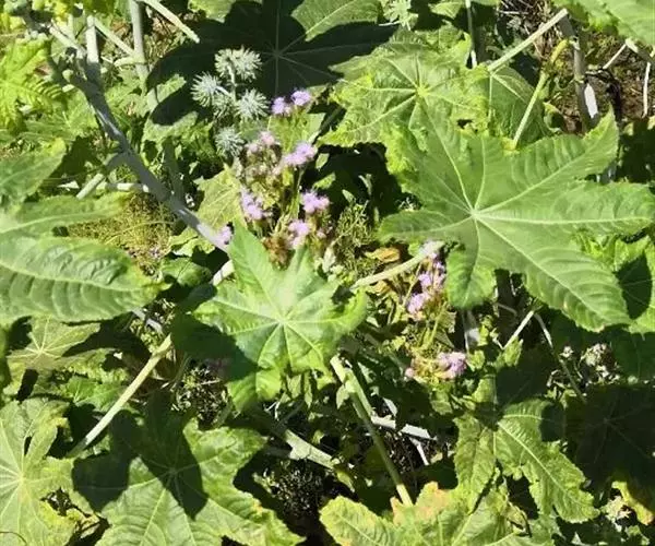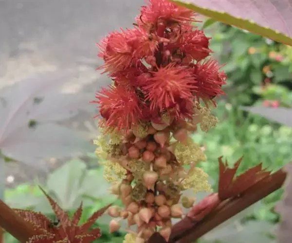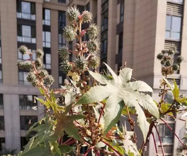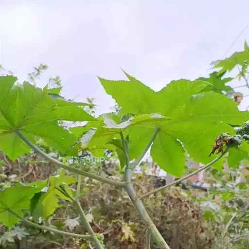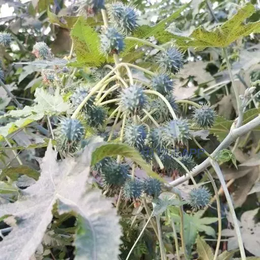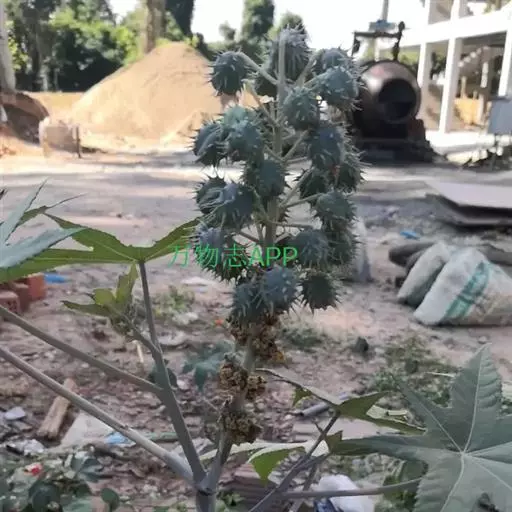 蓖麻(拉丁学名:Ricinus communis L.),为双子叶植物纲、大戟目、大戟科、蓖麻属一年生或多年生草本植物、热带或南方地区常成多年生灌木或小乔木。单叶互生,叶片盾状圆形。掌状分裂至叶片的一半以下,圆锥花序与叶对生及顶生,下部生雄花,上部生雌花;花瓣性同株,无花瓣;雄蕊多数,花丝多分枝;花柱,深红色。蒴果球形,有软刺,成熟时开裂。花期5-8月,果期7-10月。