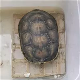 拿健康龟较重;若感觉龟体较轻,则为不健康龟的表现。将龟放入浅水中(水位达龟背甲高度的一半),观察到龟若大量、长时间饮水,则为不健康龟。再将龟竖立,开其口观察舌表面的颜色。如健康的龟,舌表面为粉红色,且湿润,表面有薄薄的白苔或薄黄苔;如为不健康的龟,舌表面为白色、赤红、青色,舌苔厚,呈深黄、乳白色或黑色。健康龟的鼻部干燥无龟裂,不健康龟的鼻部红肿、有鼻液,患病严重的龟,有的鼻孔会出血。健康龟的口腔四周清洁无黏液。