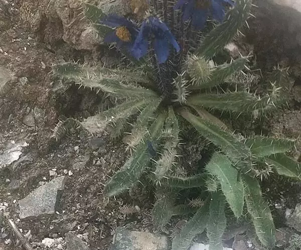 一年生草本,全体被黄褐色或淡黄色、坚硬而平展的刺,刺长0.5-1厘米。主根肥厚而延长,圆柱形,长达20厘米或更多,上部粗1-1.5厘米,果时达2厘米。叶全部基生,叶片披针形,长5-12厘米,宽约1厘米,先端钝或急尖,基部渐狭而入叶柄,边缘全缘或波状,两面被黄褐色或淡黄色平展的刺;叶柄长0.5-3厘米。花葶5-12或更多,长10-20厘米,坚硬,绿色或蓝灰色,密被黄褐色平展的刺,有时花葶基部合生。