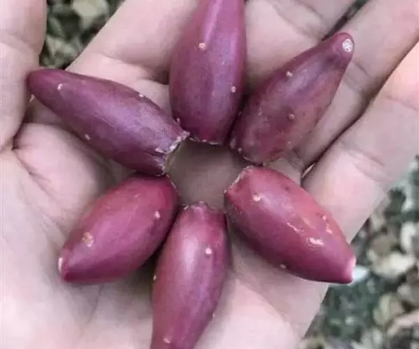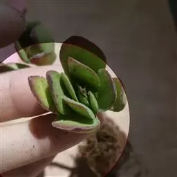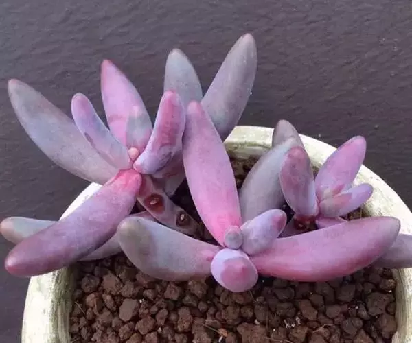 植株为多年生无毛肉质草本,长的和长叶莲花差不多,区别就是长叶莲花叶片是扁的,红手指为扁圆柱状。植株叶片环状互生排列,长圆型叶片,无叶尖但尖端部分为圆形,叶片肥厚圆润,叶片光滑有微量白粉,灰红色至紫红色。
