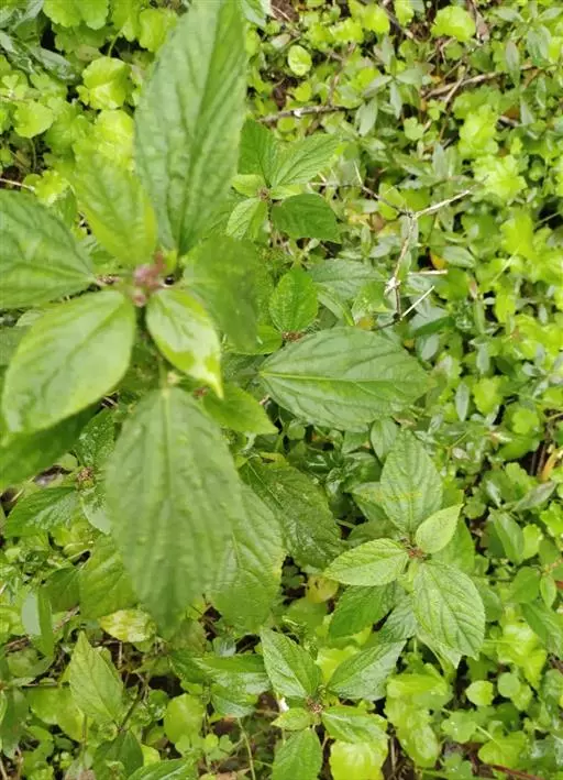 叶表面观:上表皮细胞类多角形,下表皮细胞略波状弯曲,垂周壁念珠状增厚。下表皮非腺毛及腺毛较上表皮为多,非腺毛单细胞,长166-900μm,基部直径18-38μm,壁厚6-12μm,表面有螺状纹理;腺毛头部2细胞,直径25-32μm;柄部2-3细胞。气孔不定式或不等式,副卫细胞4-5个。叶肉细胞有的含草酸钙簇晶。