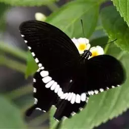 玉斑凤蝶Papilio helenus (Linnaeus, 1758)别名白纹凤蝶,是凤蝶科凤蝶属美凤蝶亚属大型种类。雌雄同型;体翅皆黑色,后翅正面中室外有3个并列的白色斑,亚外缘有1列模糊的新月形红色斑,有尾突1根;后翅反面亚外缘有1列醒目的新月形红斑,臀角处有圆形红色斑1-2个;雌蝶颜色浅褐色。