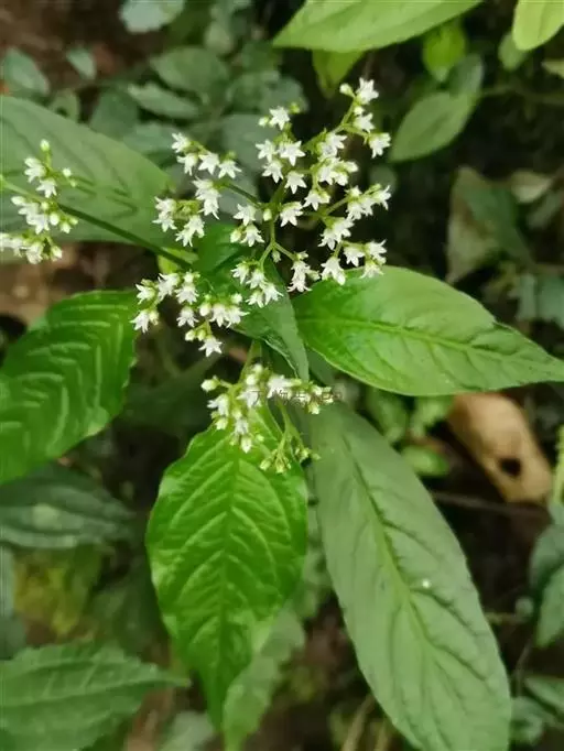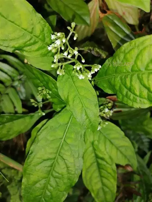 大叶度量草 多年生草本,高达60厘米。茎下部匍匐状;幼枝四棱形,老枝圆柱形;除幼叶下面、幼叶柄和花冠管喉部被短柔毛外,其余均无毛。叶片膜质至薄纸质,椭圆形、长椭圆形或披针形,有时倒披针形,长5-15厘米,宽2-5厘米,顶端渐尖至钝,基部楔形;侧脉每边8-10条;叶柄长1-2厘来;托叶退化或叶柄间成窄的叶鞘。三歧聚伞花序腋生或顶生,着花多朵;花序梗长3-7厘米;花梗长1-3毫米;苞片和小苞片披针形,长约1毫米;花萼5深裂,裂片卵状披针形,长约1毫米,宽0.5毫米,边缘膜质;花冠白色,坛状,花冠管长约1.5毫米,花冠裂片5,卵形,长约0.5毫米;雄蕊5,着生于花冠管近中部;子房近圆球形,光滑,花柱长0.5毫米,基部分离,柱头头状。蒴果近圆球状,直径2-2.5毫米,顶端有两尖角,基部有宿存花萼;种子圆球形,淡褐色,表面具小瘤状凸起。花期3-5月,果期6-7月。