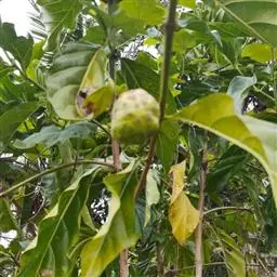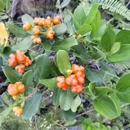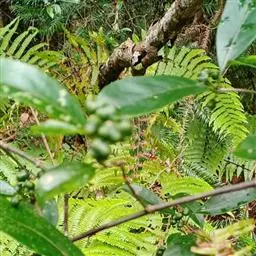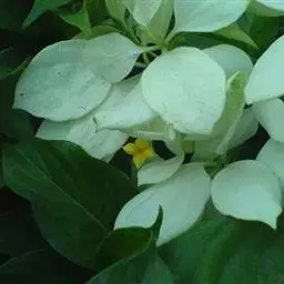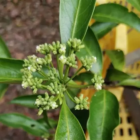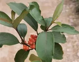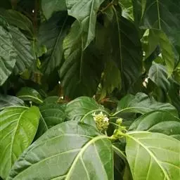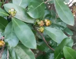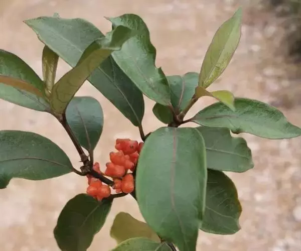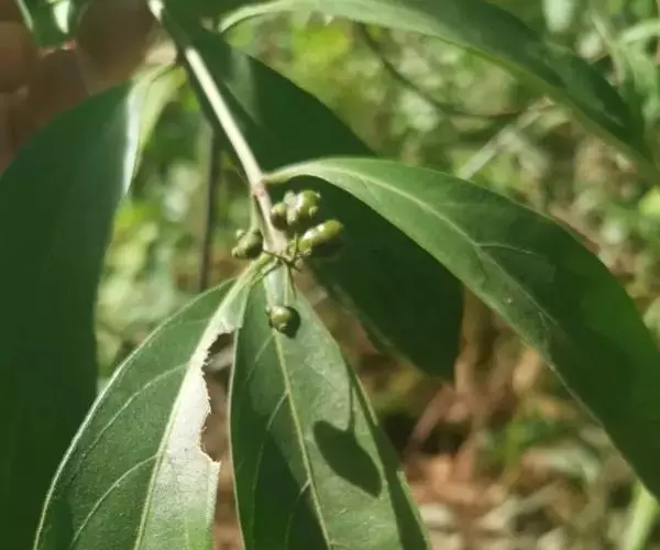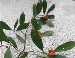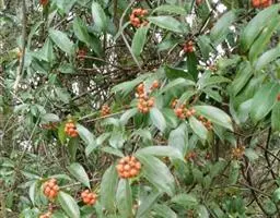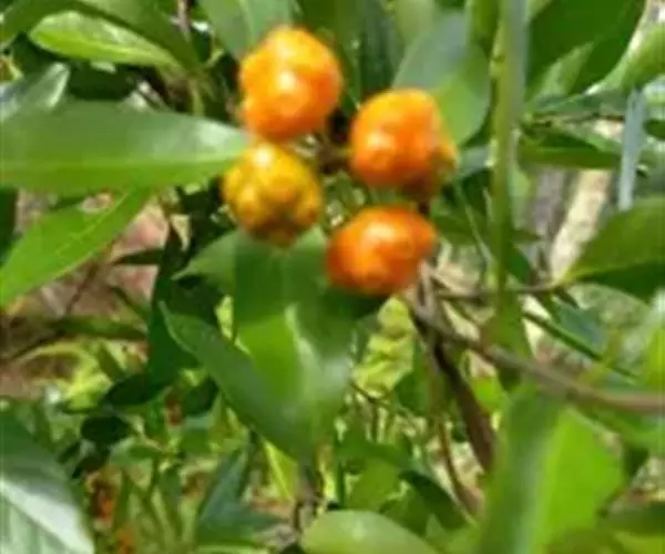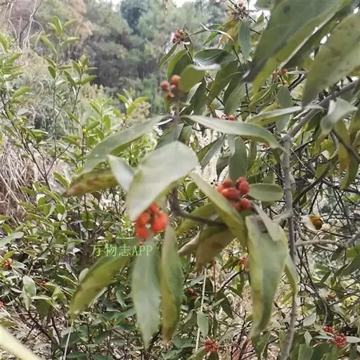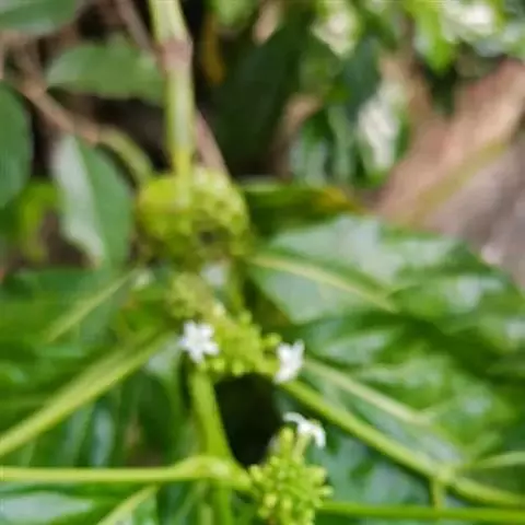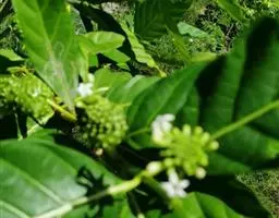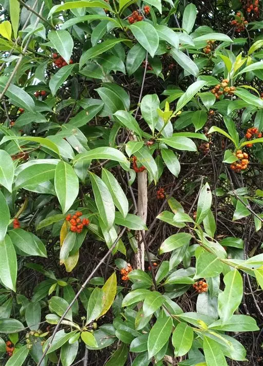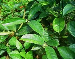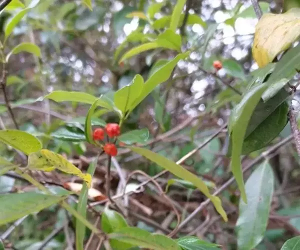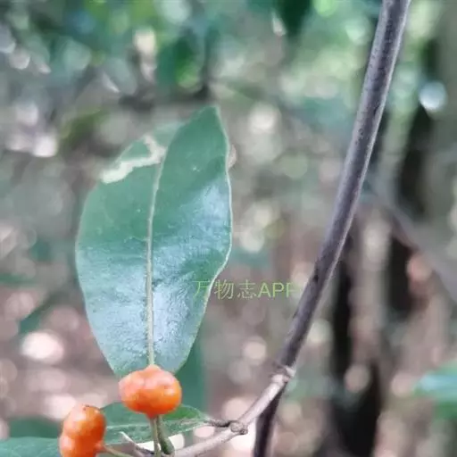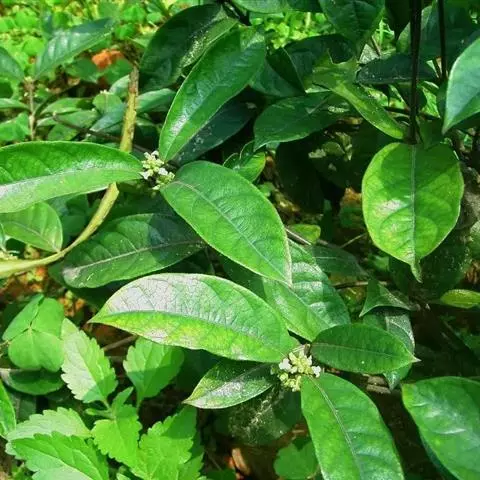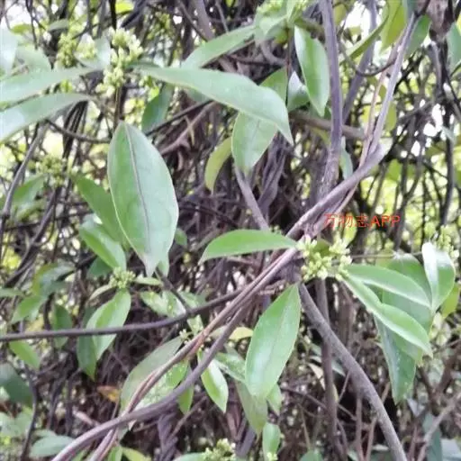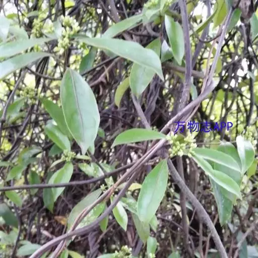羊角藤,又名糠藤、乌苑藤。攀援灌木。无毛或幼枝稍被柔毛。叶薄革质,对生;叶柄长6-10mm;托叶膜质,长2-5mm;叶片形状各式,通常长圆状披针形,长5-8(-12)cm,宽1.5-3.5cm,先端急尖或短渐尖,基部楔形,侧脉5-7对。花序顶生,伞形花序式排列,通常由6个小头状花序组成,每个小头状花序直径6-8mm,有花6-12朵;总花梗长5-12mm;萼简半球形,长0.8-1mm,先端平截或不明显齿裂;花冠白色,4裂,几达基部,裂片狭长圆形,长3-3.2mm,先端稍钝而内弯;雄蕊4,聚合果扁球形或近肾形,直径8-12mm,熟时红色,有槽纹。花期5-7月,果期6-10月。