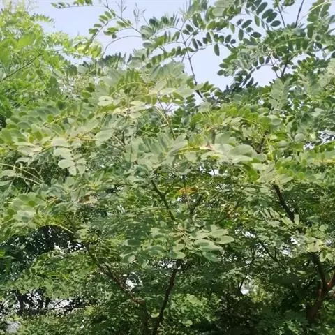 幼苗繁殖   荚果由绿变褐、种子变硬后即可采摘。荚果采摘晾干用棍棒敲打脱粒,风选,干藏。播种前催芽10天。将种子放入缸中,倒入80℃热水搅拌后浸种。第二天换水1次,第三天将种子捞出用清水冲洗,混以等体积的湿沙堆积在背风温暖处,用浸湿的麻袋或草片覆盖保温。七八天后种子约有1/3露白时即可播种。   选择地势较高、土壤肥沃的砂壤土做床。育苗地要整平整细,施足底肥,垄距为60厘米,沟深15厘米。在3月~4月采用开沟条播法播种,播幅约10厘米,每667平方米用种量4千克~5千克。播种后要保持土壤湿润,如土壤过干影响出苗,可在垄沟内灌水洇湿土壤,切忌浇水漫过垄面,以免土壤板结,影响出苗。   幼苗长出第二片真叶后及时间苗,拔掉病弱株和过密株,株距10厘米。间苗后要及时浇水。   大苗培育   播种苗当年以根系培养为主,要加强水肥管理,及时清除杂草。幼苗无须修剪,以促进形成发达根系,为养根阶段打好基础。幼苗10厘米高时,可结合浇水施1次人粪尿,此后每月追肥2次,化肥与人粪尿可间隔施用。要注意及时灌水,雨季排涝,立秋后停止施肥、浇水。   播种苗当年上冻前起苗分级假植越冬。主干通直、粗壮、高达2米以上的幼苗,带干假植;其他幼苗自根颈以上5厘米处截干,将苗根埋藏越冬。翌年4月上旬定植进行养干,定植株行距40厘米×60厘米。   育苗地施足底肥,翌年4月上旬将假植苗取出,剪去坏根、病根,将主根剪去5厘米根尖后定植,及时浇定植水。对带干定植苗采用斩梢接干法进行接干培养。萌芽前,在苗干上部选饱满的侧芽枝上进行中短截,促进侧芽发育成枝,向上生长,以延长主干。此期要加强肥水管理,及时去除其余侧枝,促进主干生长。当年即可达到园林用苗的干高要求(一般干高要求为2.5米~3.5米)。   对截干定植苗,待萌蘖条长到15厘米以上时留1个长势旺盛的枝条作为主干培育,其余枝条要及时去除。加强水肥管理,在水肥充足的情况下,截干当年新主干即可接近或达到干高要求,且干形顺直。   第三年春季对达到干高要求的苗木进行摘心,促发侧枝形成树冠,使枝叶量增加,以利于树木生长和干径加粗。如果植株过密时,可于翌年春季开始萌芽前进行抽稀移栽,培育大规模园林用苗。