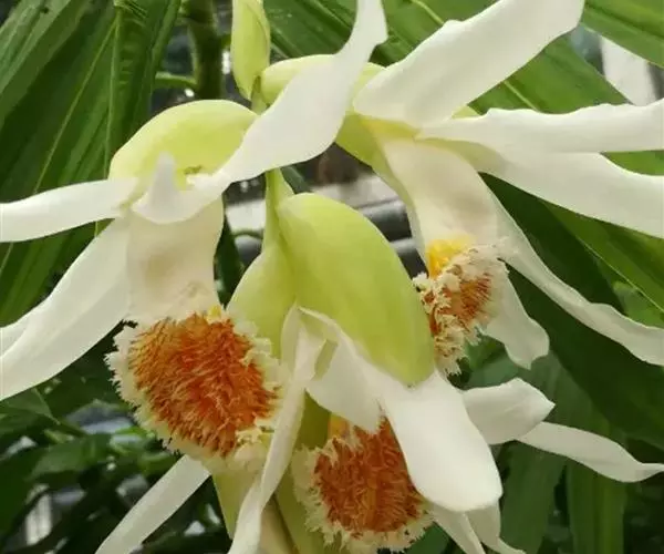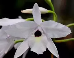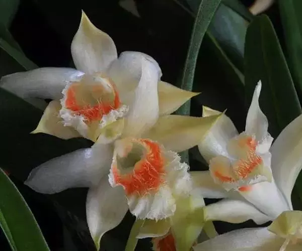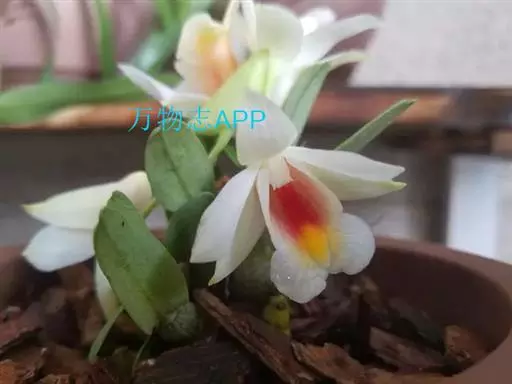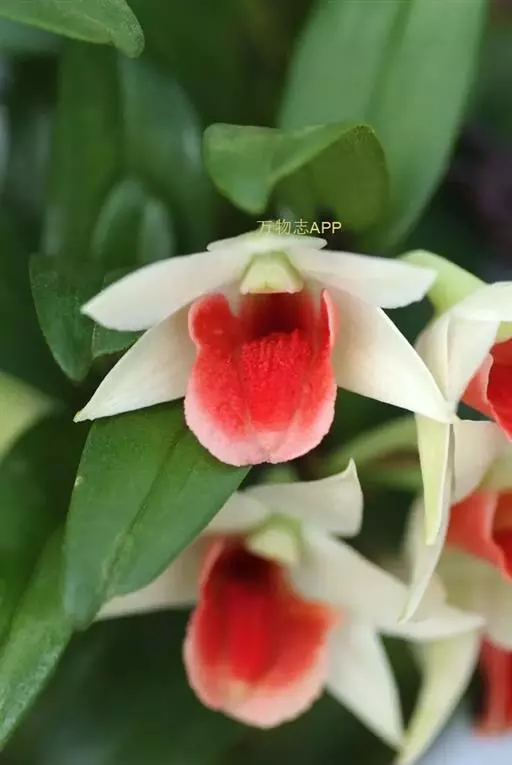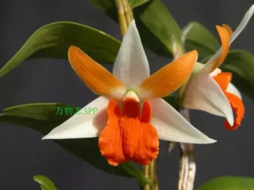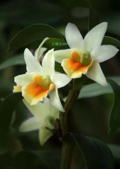 翅萼石斛(学名:Dendrobium cariniferum Rchb. f.):茎肉质状粗厚,圆柱形或有时膨大呈纺锤形,具6个以上的节。叶革质,数枚,二列,长圆形或舌状长圆形。总状花序出自近茎端,常具1-2朵花;花开展,质地厚,具橘子香气;花瓣白色,长圆状椭圆形,长约2厘米,宽1厘米,先端锐尖,具5条脉;唇瓣喇叭状,3裂。蒴果卵球形,粗达3厘米。花期3-4月。