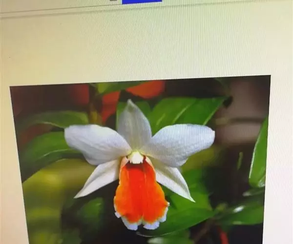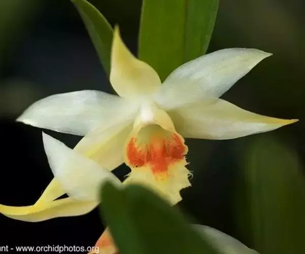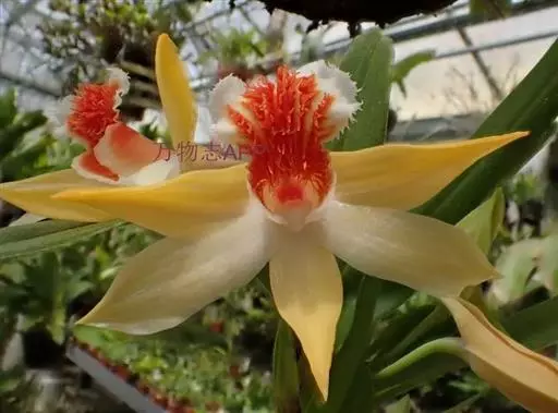 花瓣白色,长圆状椭圆形,长约2厘米,宽1厘米,先端锐尖,具5条脉;唇瓣喇叭状,3裂;侧裂片橘红色,围抱蕊柱,近倒卵形,前端边缘具细齿;中裂片黄色,近横长圆形,先端凹,前端边缘具不整齐的缺刻;唇盘橘红色,沿脉上密生粗短的流苏;蕊柱白色带橘红色,长约7毫米;药帽白色,半球形,前端边缘密生乳突状毛。