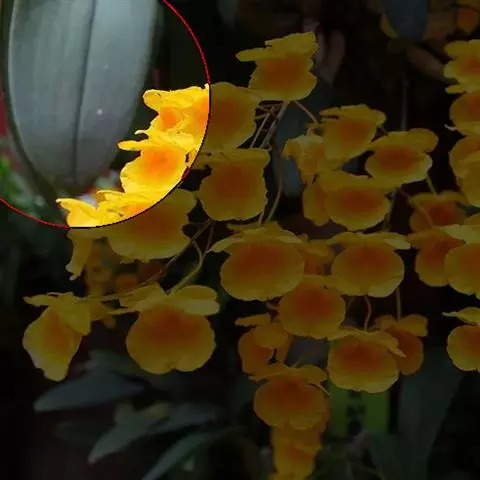 总状花序出自近茎端,常具1-2朵花;花序柄长5-10毫米,基部被3-4枚鞘;花苞片卵形,长4-5毫米,先端急尖;花梗和子房长约3厘米;子房黄绿色,三棱形;花开展,质地厚,具橘子香气;中萼片浅黄白色,卵状披针形,长约2.5厘米,宽9毫米,先端急尖,在背面中肋隆起呈翅状;侧萼片浅黄白色,斜卵状三角形,与中萼片近等大;萼囊淡黄色带橘红色,呈角状,长约2厘米,近先端处稍弯曲。