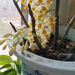 球花石斛,是兰科石斛属的多年生附生草本。茎直立或斜立,圆柱形,粗壮,基部收狭为细圆柱形,不分枝,…