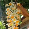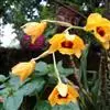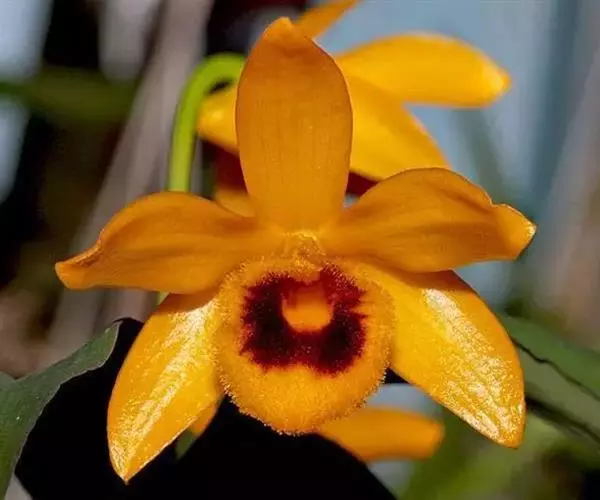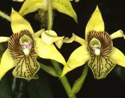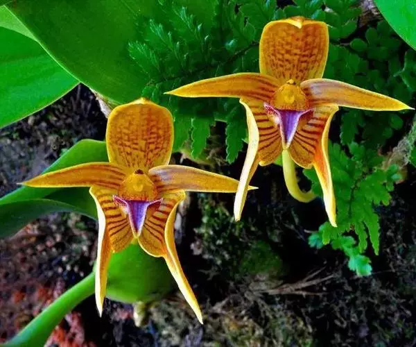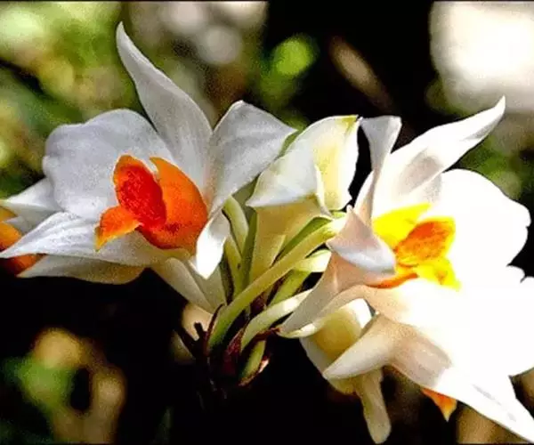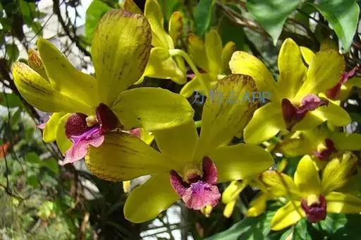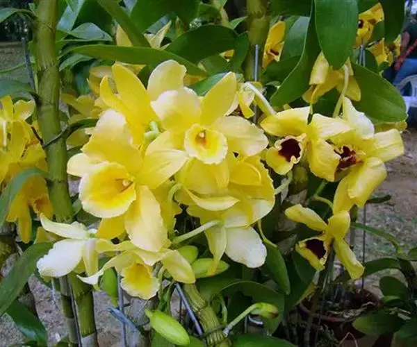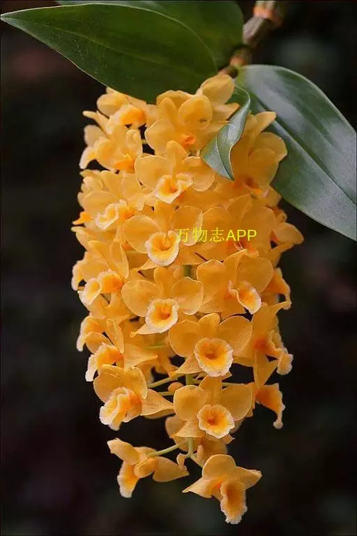 密花石斛(学名:Dendrobium densiflorum Lindl.):茎粗壮,通常棒状或纺锤形,下部常收狭为细圆柱形,不分枝,具数个节和4个纵棱;叶常3-4枚,近顶生,革质,长圆状披针形。总状花序从去年或2年生具叶的茎上端发出,下垂,密生许多花,花开展,萼片和花瓣淡黄色;花瓣近圆形,长1.5-2厘米,宽1.1-1.5厘米,基部收狭为短爪,中部以上边缘具啮齿,具3条主脉和许多支脉;唇瓣金黄色,圆状菱形。花期4-5月。
