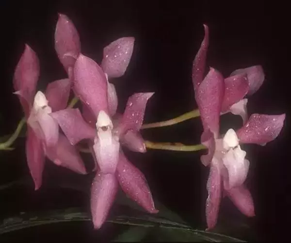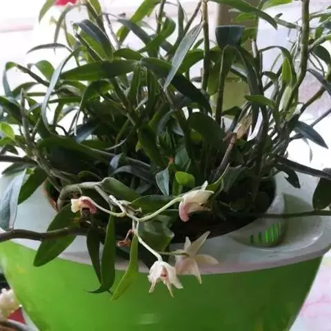 重唇石斛:茎下垂,圆柱形或有时从基部上方逐渐变粗,具少数至多数节。叶薄革质,狭长圆形或长圆状披针形。…