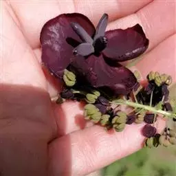 总状花序自短枝上簇生叶中抽出,下部有1-2朵雌花,以上约有15-30朵雄花,长6-16厘米;总花梗纤细,长约5厘米。雄花:花梗丝状,长2-5毫米;萼片3,淡紫色,阔椭圆形或椭圆形,长2.5-3毫米;雄蕊6,离生,排列为杯状,花丝极短,药室在开花时内弯;退化心皮3,长圆状锥形。雌花:花梗稍较雄花的粗,长1.5-3厘米;萼片3,紫褐色,近圆形,长约10-12毫米,宽约10毫米,先端圆而略凹入,开花时广展反折;退化雄蕊6枚或更多,小,长圆形,无花丝;心皮3-9枚,离生,圆柱形,直,长(3)4-6毫米,柱头头状,具乳凸,橙黄色。