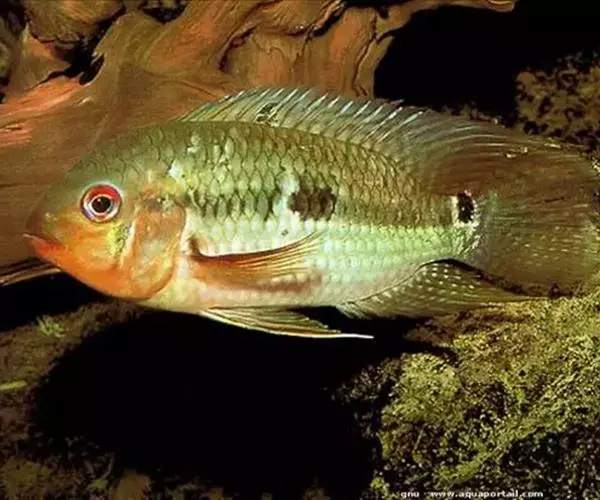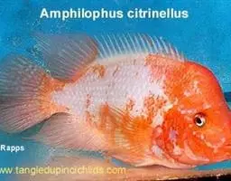 火口鱼 体长20到25公分,原产于中美洲瓜地马拉,喜好弱酸至中性水质,较喜欢干净的软水。性情凶悍,色彩变化大,有些鱼色彩艳丽,但养得不好则毫无特色可言。强健好养,饲饵料不拘。繁殖亦不,难但雌雄鱼的分辨并不容易,且老成雄鱼前额突出,发情时异常凶猛,配对时必须特别小心,否则其伴侣常被攻击致死。由于它是繁殖血鹦鹂的亲鱼之一,因此市面虽不多见,但在鱼场中却是炙手可热的鱼种。