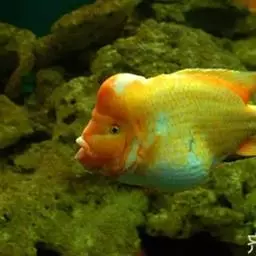 紫红火口鱼,大型慈鲷,厚侧扁形,口中位,口裂中等,大者可长达30厘米,额头稍隆起,喉部至胸部鲜红如火,因此而得“火口”之名。躯干前部金黄色,向后渐衍变为黄绿色至深紫色。血鹦鹉鱼的母本,金刚鹦鹉鱼的父本。