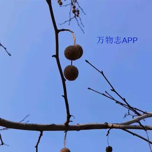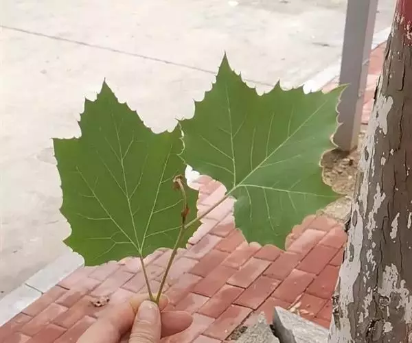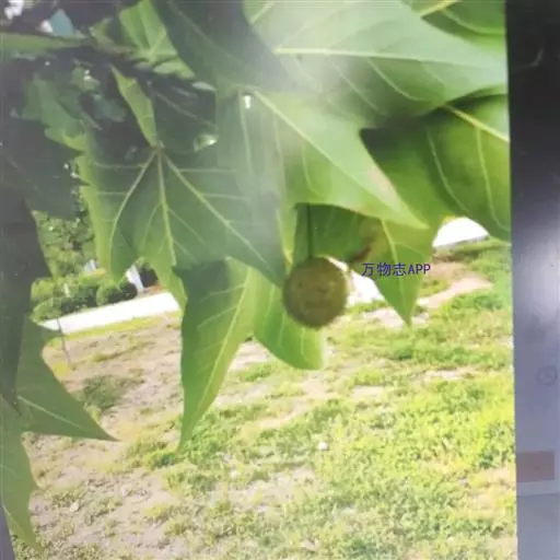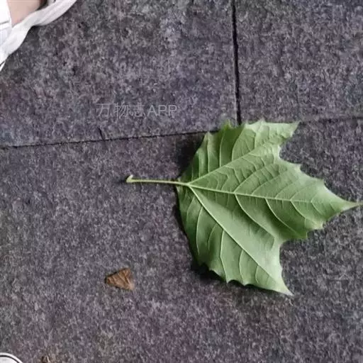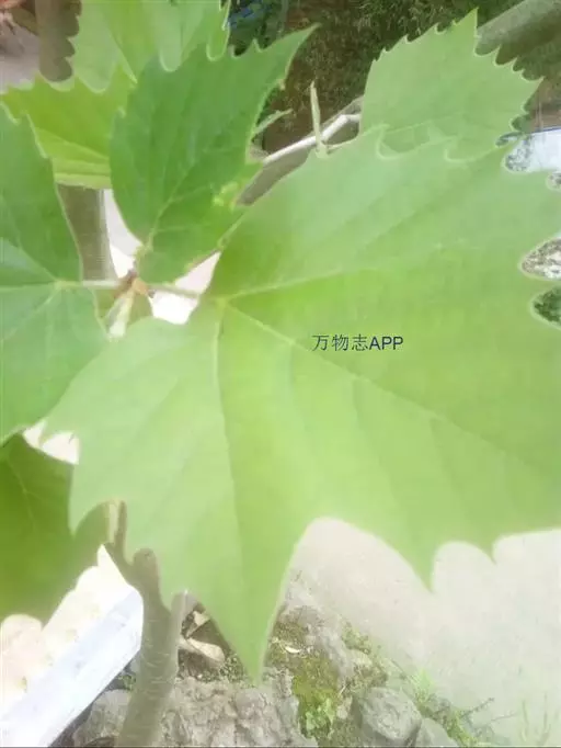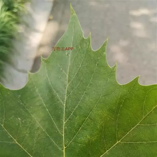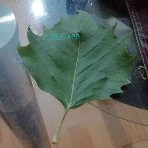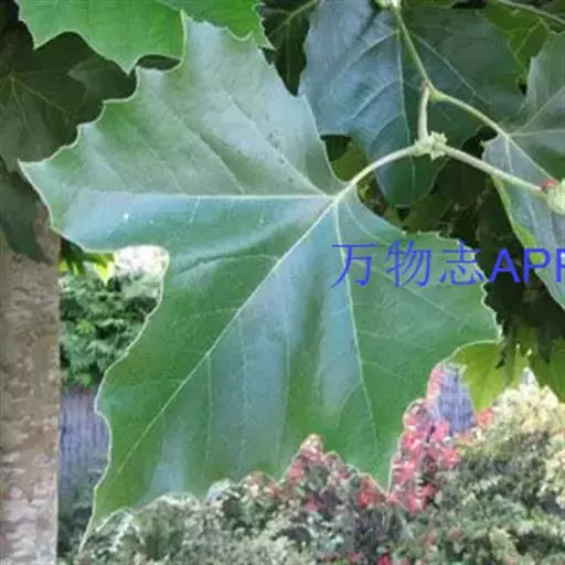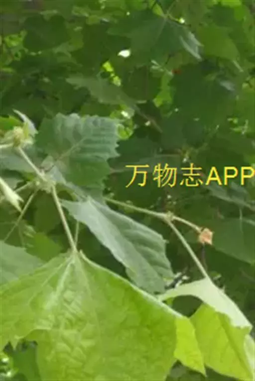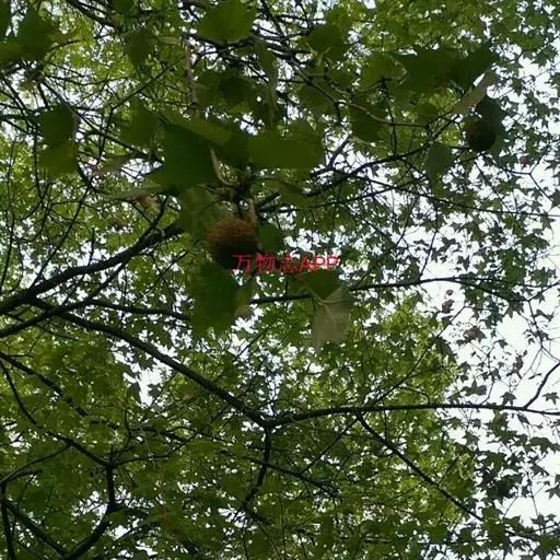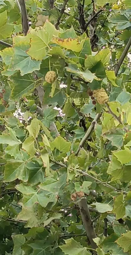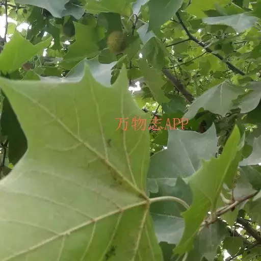一球悬铃木 落叶大乔木,高40余米;树皮有浅沟,呈小块状剥落;嫩枝有黄褐色绒毛被。叶大、阔卵形,通常3浅裂,稀为5浅裂,宽10-22cm,长度比宽度略小;基部截形,阔心形,或稍呈楔形;裂片短三角形,宽度远较长度为大,边缘有数个粗大锯齿;上下两面初时被灰黄色绒毛,不久脱落,上面秃净,下面仅在脉上有毛,掌状脉3条,离基约1厘米;叶柄长4-7cm,密被绒毛;托叶较大,长约2-3cm,基部鞘状,上部扩大呈喇叭形,早落。