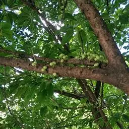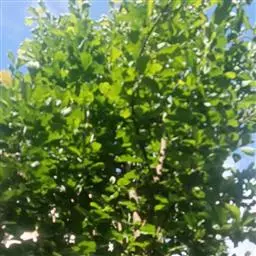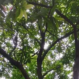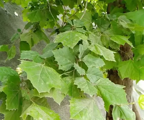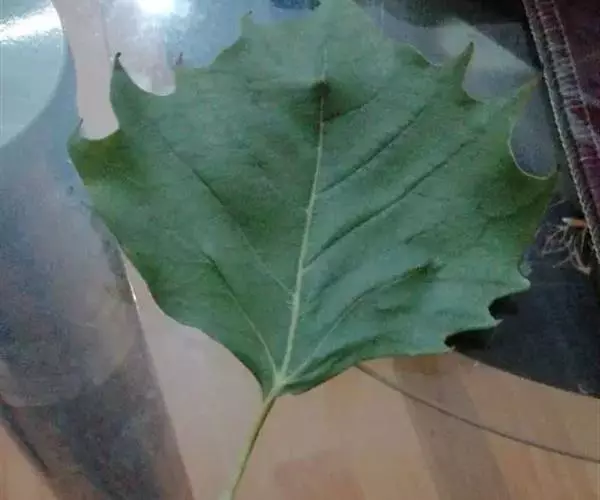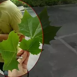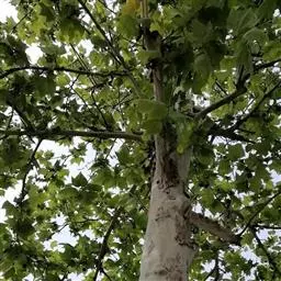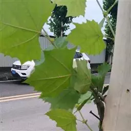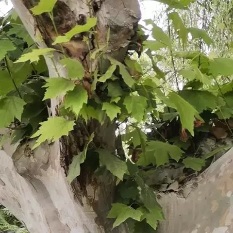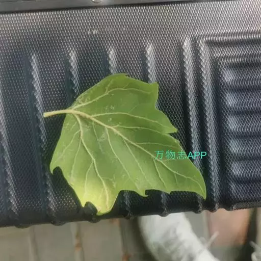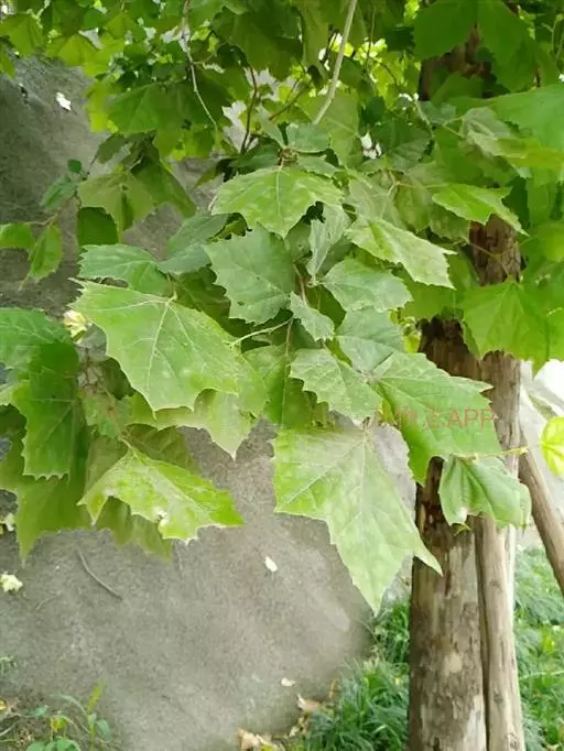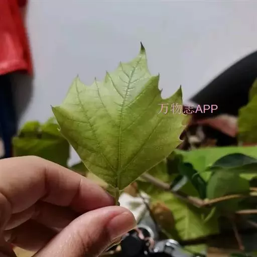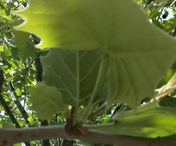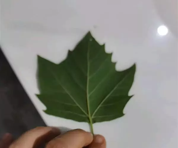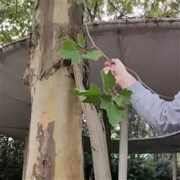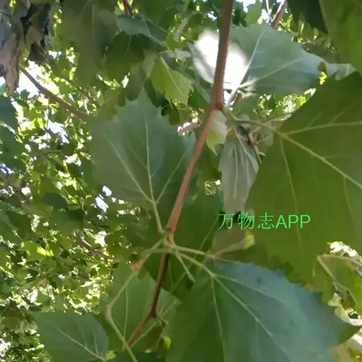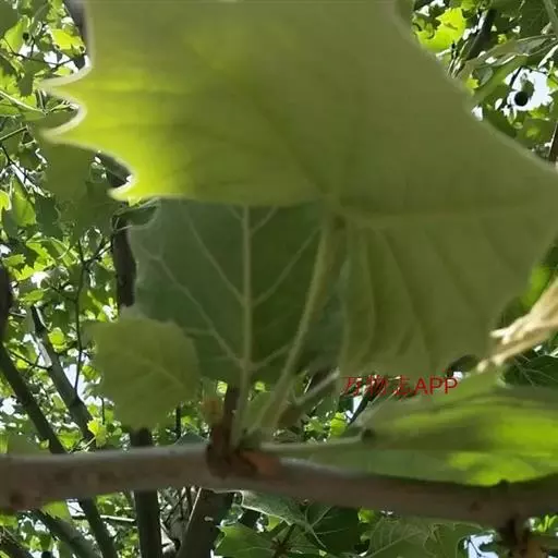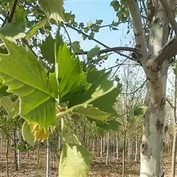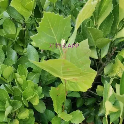 一球悬铃木 落叶大乔木,高40余米;树皮有浅沟,呈小块状剥落;嫩枝有黄褐色绒毛被。叶大、阔卵形,通常3浅裂,稀为5浅裂,宽10-22cm,长度比宽度略小;基部截形,阔心形,或稍呈楔形;裂片短三角形,宽度远较长度为大,边缘有数个粗大锯齿;上下两面初时被灰黄色绒毛,不久脱落,上面秃净,下面仅在脉上有毛,掌状脉3条,离基约1厘米;叶柄长4-7cm,密被绒毛;托叶较大,长约2-3cm,基部鞘状,上部扩大呈喇叭形,早落。