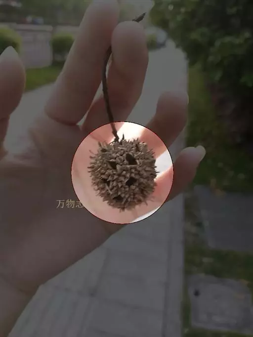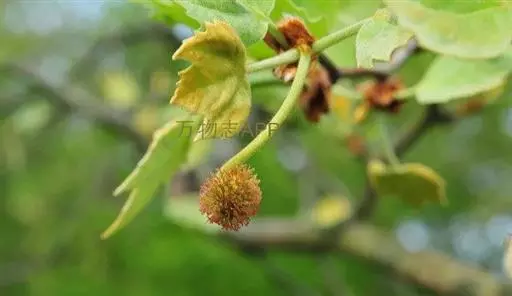头状果序圆球形,单生稀为2个,直径约3cm,宿存花柱极短;小坚果先端钝,基部的绒毛长为坚果之半,不突出头状果序外。花期5月,果期9-10月。