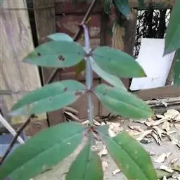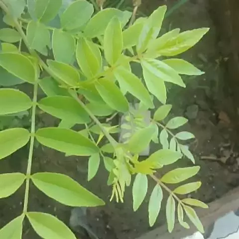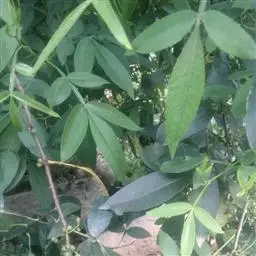叶有小叶11-27片或稍多;小叶整齐对生,狭长披针形或位于叶轴基部的近卵形,长7-18cm,宽2-6cm,顶部渐狭长尖,基部圆,对称或一侧稍偏斜,叶缘有明显裂齿,油点多,肉眼可见,叶背灰绿色或有灰白色粉霜,中脉在叶面凹陷,侧脉每边11-16条。