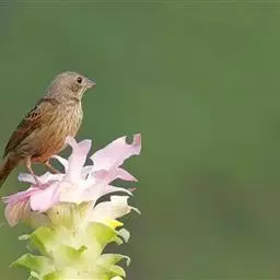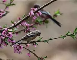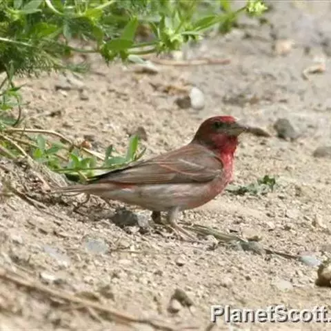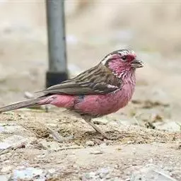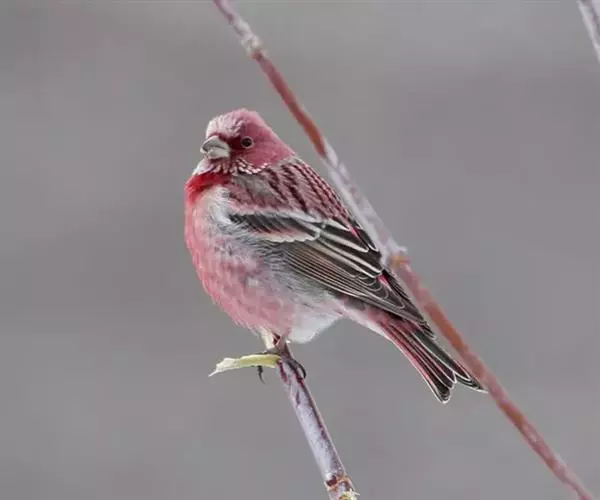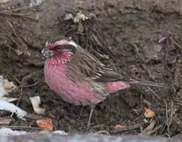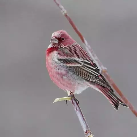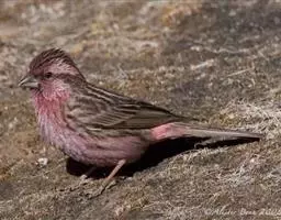 北朱雀(学名:Carpodacus roseus):雄鸟额前头及喉均银白色,具粉红色羽缘,呈鳞片状,头顶余部及后颈粉红,背灰褐而羽缘粉红,具较宽黑色羽干纹,腰和尾上覆粉红色,尾羽黑褐色,外羽片具粉红色边缘。飞羽黑褐色,具棕白沾粉红边缘;翅上覆羽具近白沾粉红的宽阔羽端,形成两道横斑。下体均呈粉红色,下腹近白;腋羽及尾下覆羽白,染粉红色。雌鸟头顶、头侧灰褐,羽缘粉红,各羽具黑褐色羽干纹,背灰褐,杂以粉红色,尾羽外羽片棕白色。下体棕白,杂以较明显粉红色,具黑褐色羽干纹,余者和雄鸟相似。虹膜:红色,嘴棕褐色,脚深灰褐色。