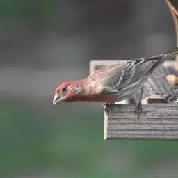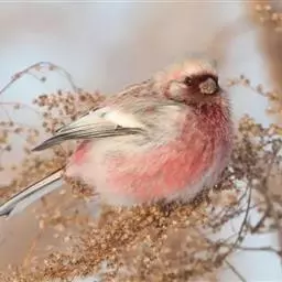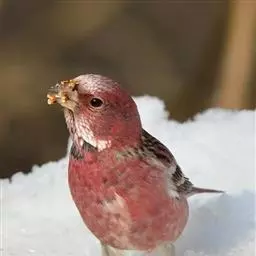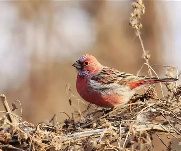红腰朱雀:体长12-14厘米,小型鸟类。雄鸟前额和眉纹玫瑰粉红色,头顶和一宽的贯眼带深红褐色,背红…