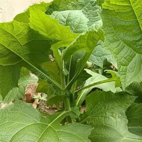山牛蒡 多年生草本,高0.7-1.5米。根状茎粗。茎直立,单生,粗壮,基部直径达2厘米,上部分枝或不分枝,全部茎枝粗壮,有条棱,灰白色,被密厚绒毛或下部脱毛而至无毛。基部叶与下部茎叶有长叶柄,叶柄长达34厘米,有狭翼,叶片心形、卵形、宽卵形、卵状三角形或戟形,不分裂,长10-26厘米,宽12-20厘米,基部心形或戟形.或平截,边缘有三角形或斜三角.形粗大锯齿,但通常半裂或深裂,向上的叶渐小,卵形、椭圆形、披针形或长椭圆状披针形,边缘有锯齿或针刺,有短叶柄至无叶柄。全部叶两面异色,上面绿色,粗糙,有多细胞节毛,下面灰白色,被密厚的绒毛。