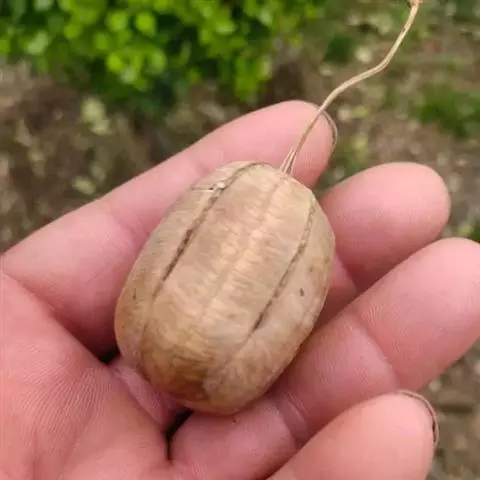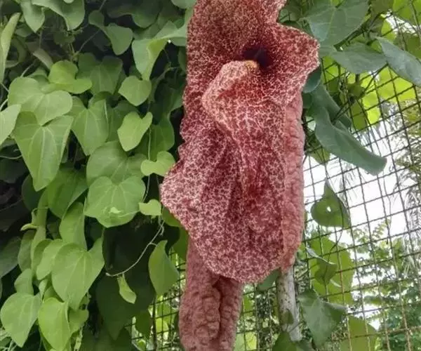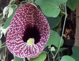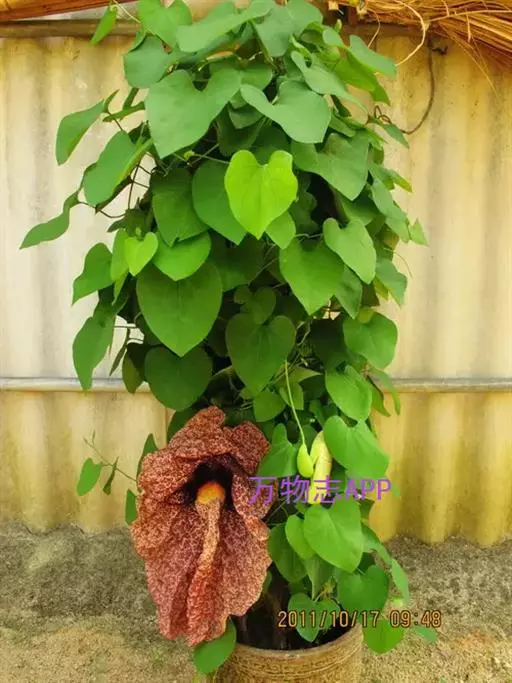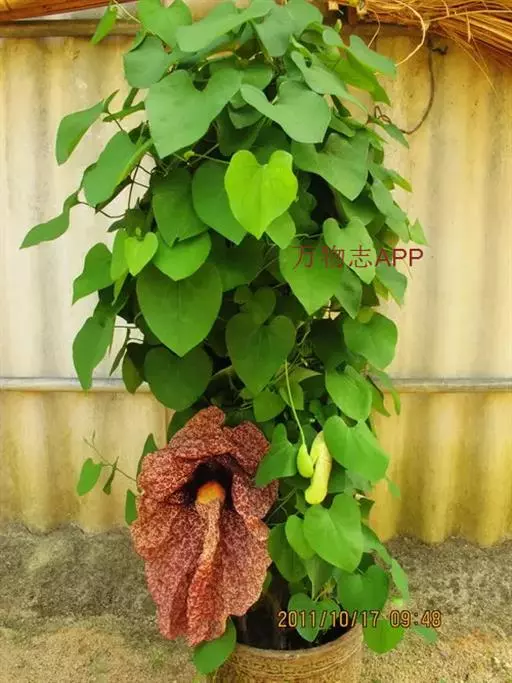形态特征:大型木质藤本,茎粗糙,具棱。蔓可长达10米。叶互生,卵状心形,全缘,顶端尖,基部心形,具叶柄,着于老茎上,花大,紫褐色,具白色斑点。