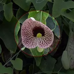 “巨花马兜铃”属马兜铃科大型木质藤本常绿植物,因其花朵特大,成熟的果实像挂在马脖子底下的铃铛而得名。“巨花马兜铃”和猪笼草、捕蝇草等食虫植物不同,它不仅捕捉昆虫,还能养着昆虫,帮助其传粉而不伤害昆虫。 “巨花马兜铃”的奇特之处不仅在于它们美丽而怪异的花朵,不像普通的花朵具有对称的花瓣,而且尤其奇异的是它的形态结构非常独特,花朵基部有一个膨大的囊,囊中既有雌蕊又有雄蕊,但雌蕊先于雄蕊一天成熟,因此不能进行自花授粉,必须靠昆虫进行异花授粉。“巨花马兜铃”花朵散发出来的怪异味道和花瓣的斑点能引诱穿梭于花丛之中的昆虫进入囊中,由于内壁布满了倒毛,因此昆虫一旦进入囊中就失去自由。雄蕊成熟后花药破裂散出花粉,这时花朵内壁的倒毛萎缩变软,满身沾满花粉的昆虫就可以飞离囊中,带着满身的花粉飞向另一个刚刚开放的花朵,将花粉传到柱头上。
