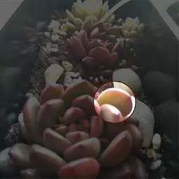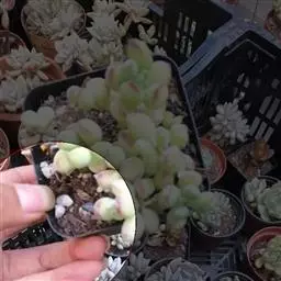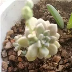 姬秋丽单株直径可达3厘米,丛生植株直径可达25厘米以上,高 姬秋丽的花苞 度可达15厘米,多分枝。叶片饱满圆润,倒卵形,朝上一面扁平或轻微凸起,朝下一面凸起,叶尖钝圆。 长度可达1.0~1.5厘米,宽度约为0.5厘米。从基部至顶端叶片逐渐缩小。在光照充足、温差大的环境下呈淡粉的奶油色,光照不足或潮湿环境下呈灰绿色,叶痕为深红色。