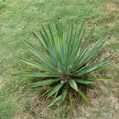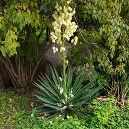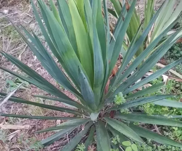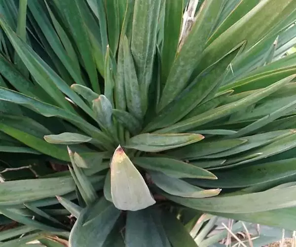 丝兰 茎很短或不明显。叶近莲座状簇生,坚硬,近剑形或长条状披针形,长25-60厘米,宽2.5-3厘米,顶端具一硬刺,边缘有许多稍弯曲的丝状纤维。