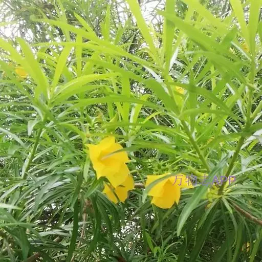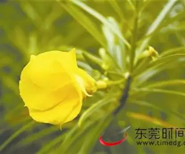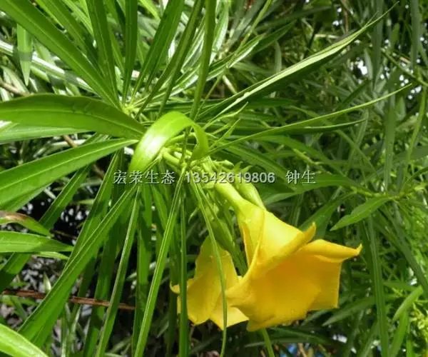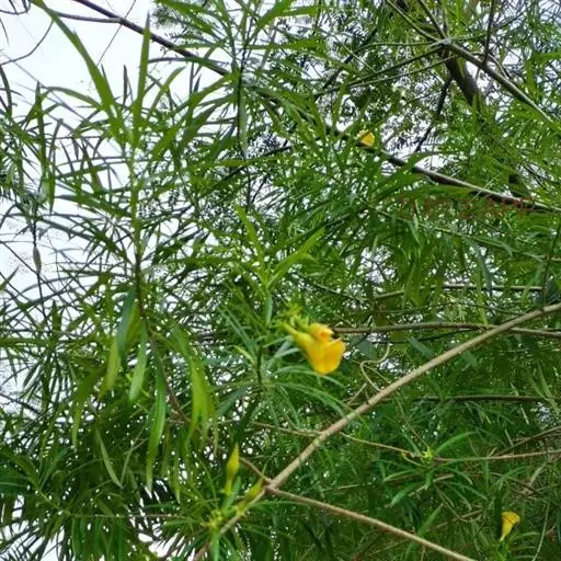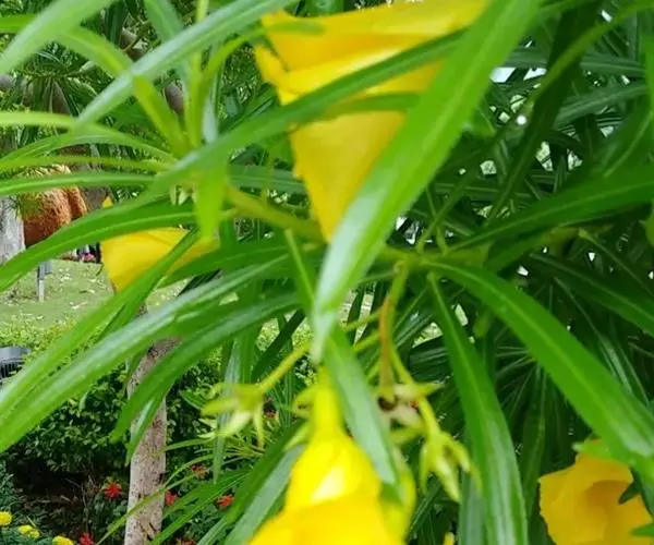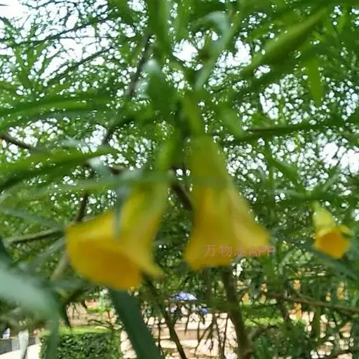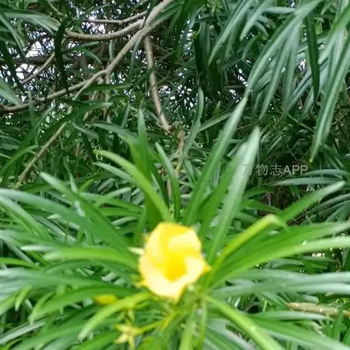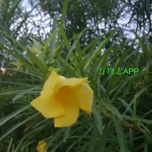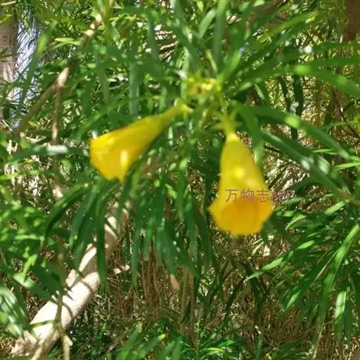 黄花夹竹桃(学名:Thevetia peruviana (Pers.)K. Schum.),又名“酒杯花”“柳木子”“黄花状元竹”,是夹竹桃科,黄花夹竹桃属下的常绿乔木植物。高达5m,全株无毛,树皮棕褐色;叶互生,近革质,线形或线状披针形;花大,黄色,具香味,顶生聚伞花序;核果扁三角状球形;花期5-12月。