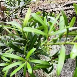 叶互生,近革质,无柄,线形或线状披针形,两端长尖,长10-15cm,宽5-12mm,表面有光泽,两面无毛,全缘,边稍背卷;中脉在叶面下陷,在叶背凸起,侧脉两面不明显。