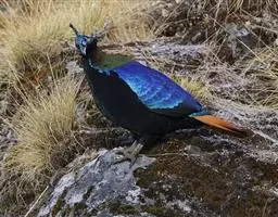 蓝马鸡是珍稀名贵的禽类,羽毛美丽,可作装饰用,头侧绯红,耳羽簇白色、突出于颈部顶上,通体蓝灰色,…