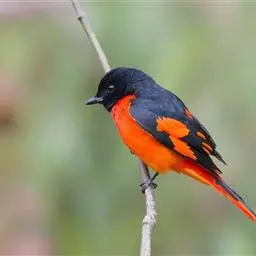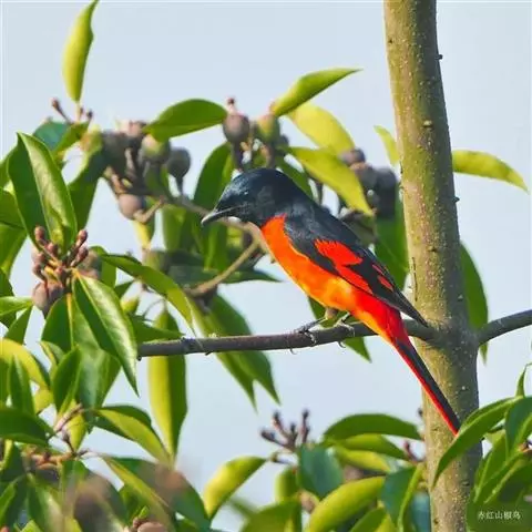 灰喉山椒鸟(学名:Pericrocotus solaris):共有8个亚种。体长18-22厘米。雄鸟头部和背亮黑色,腰、尾上覆羽和下体朱红色,翅黑色具一大一小的两道朱红色翼斑。中央尾羽黑色,外侧尾羽基部黑色,端部红色。雌鸟额、头顶前部、颊、耳羽和整个下体均为黄色,腰和尾上覆羽亦为黄色。翅和尾颜色与雄鸟大致相似,但其上的红色由黄色取代。