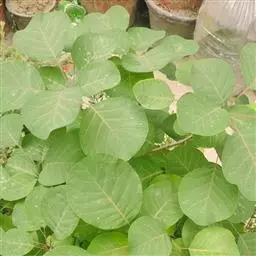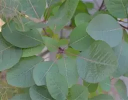 粉背黄栌叶卵圆形,较大,长3.5-10厘米,宽2.5-7.5厘米,无毛,但叶背显著被白粉;叶柄较长,…