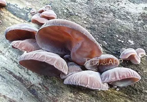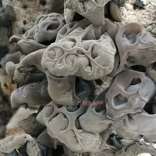 实体丛生,常覆瓦状叠生。耳状。叶状或近林状,边缘波状,薄,宽2-6cm,最大者可达12cm,厚2mm左右,以侧生的短柄或狭细的基部固着于基质上。初期为柔软的胶质,粘而富弹性,以后稍带软骨质,干后强烈收缩,变为黑色硬而脆的角质至近革质。背面外面呈弧形,紫褐色至暗青灰色,疏生短绒毛。绒毛基部褐色,向