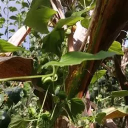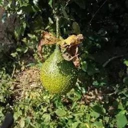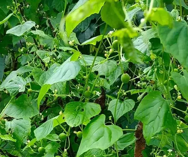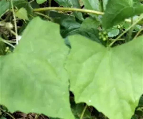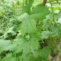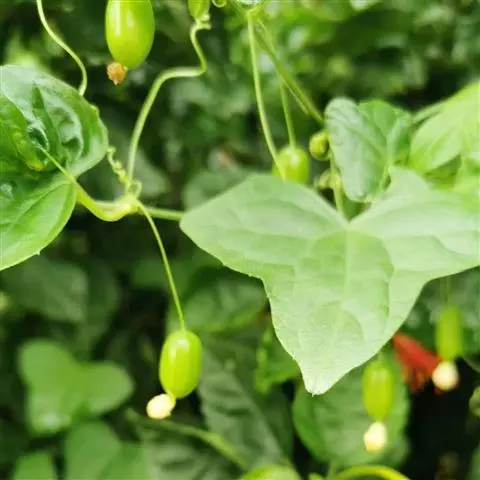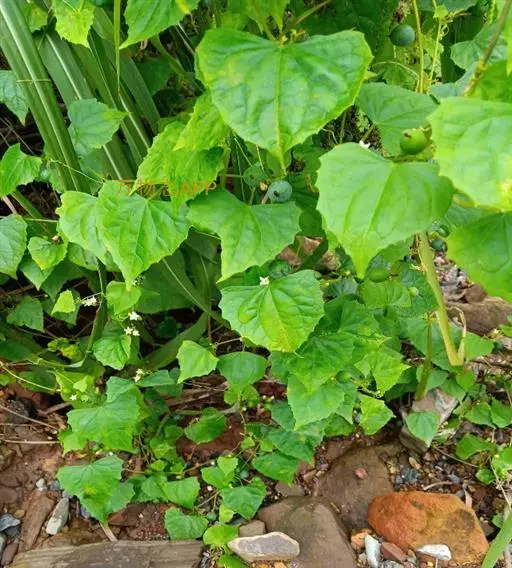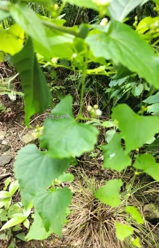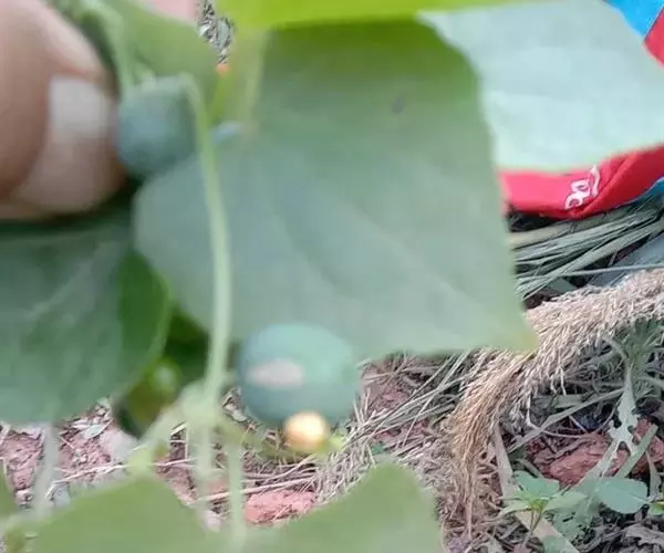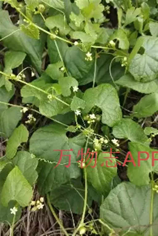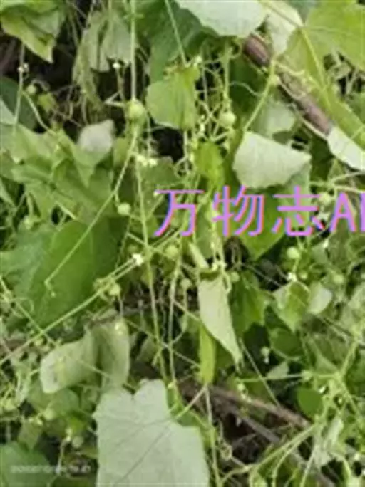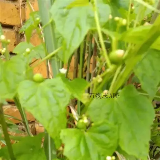 钮子瓜,又名野杜瓜。草质藤本。茎、枝细弱,伸长,有沟纹,多分枝。叶柄细,长2-5cm,无毛;叶片膜质,宽卵形和稀三角状卵形,长、宽均为1-10cm,上面深绿色,粗糙,被短糙毛,背面苍绿色,近无毛,先端急尖或短渐尖,基部弯缺半圆形,边缘有细锯齿或深波状锯齿,不分裂或有时3-5浅裂,脉掌状。卷须丝状,单一,无毛。花雌雄同株;雄花3-9朵生于总梗顶端,呈近头状或伞房状花序,花序梗纤细,长1-4cm,无毛;雄花梗开展,极短,长1-2mm;花萼筒宽钟状,长2mm,宽1-2mm,无毛或被微柔毛,裂片狭三角形,长0.5m;花冠白色,裂片卵形,或卵状长圆形,长2-2.5mm,上部常被柔毛;雄蕊3,2枚2室,1枚1室,有时全部为2室,插生在花萼筒基部,花丝长2mm,被短柔毛;雌花单生,稀几朵着生在总梗顶端或极稀雌雄同序;子房卵形。果梗细,无毛,长0.5-1cm,果实球状或卵形,直径1-1.4cm,浆果状,外面光滑无毛。种子卵状长圆形,扁压,平滑,边缘稍拱起。花期4-8月,果期8-11月。