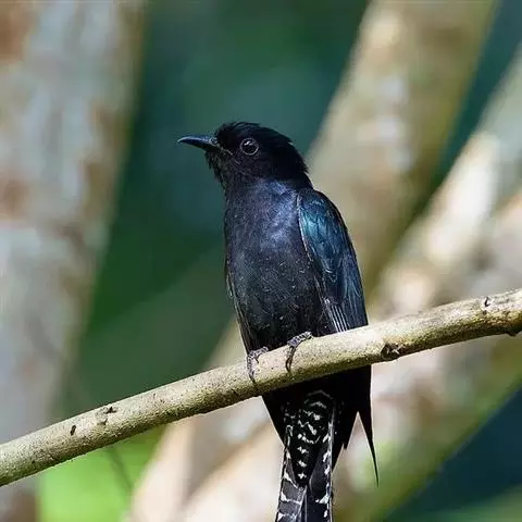 斑翅凤头鹃: 成鸟具羽冠,上体及头侧、翅、尾等黑色,具铁绿色亮辉,尾羽端部具白斑,两侧者形宽,…