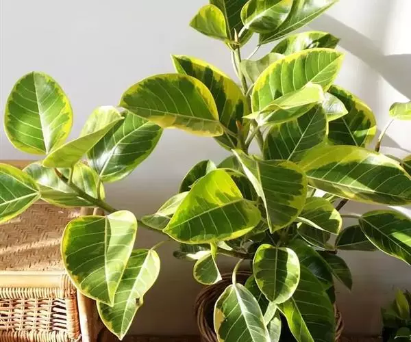 花叶高山榕是常绿乔木,株高10-12米,冠幅6-8米,树皮灰色,平滑;幼枝绿色,粗约10毫米,被微柔毛。叶互生,长卵形,长15-24厘米,叶面深绿色,边缘浅绿及黄色斑纹,叶脉黄绿色,先端钝,急尖,基部宽楔形,全缘,两面光滑,无毛,基生侧脉延长,侧脉5-7对;叶柄长2-5厘米,粗壮;托叶厚革质,长2-3厘米,外面被灰色绢丝状毛。 [1-2]