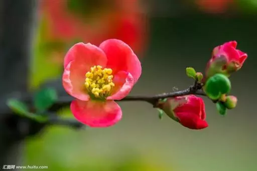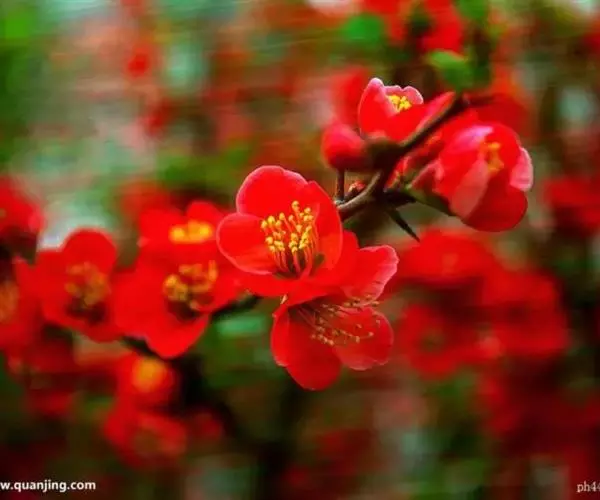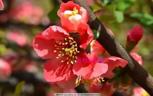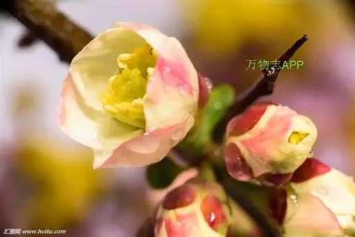 花先叶开放,2-3朵簇生于二年生枝上,花梗短粗或近于无梗;花直径2-4厘米;萼筒钟状,外面无毛或稍有短柔毛;萼片直立,卵圆形至椭圆形,长3-5毫米,宽3-4毫米,先端圆钝至截形,全缘或有浅齿及黄褐色睫毛;花瓣倒卵形或近圆形,长10-15毫米,宽8-15毫米,淡红色或白色;雄蕊45-50,长约花瓣之半;花柱5,基部合生,下半部被柔毛或绵毛,柱头头状。果实卵球形或近圆柱形,先端有突起,长8-12厘米,宽6-7厘米,黄色有红晕,味芳香。花期3-5月,果期9-10月。